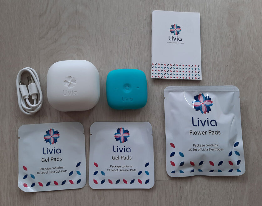 Das Livia-Set enthält das Elektrostimulationsgerät, sogenannte Flower Pads (so werden die Elektroden genannt) mit einem 30 cm langen Kabel und bereits angebrachten Gel-Pads sowie Ersatzpaare der Gel-Pads, eine Schutzhülle bzw. Transportbox sowie ein Ladekabel.