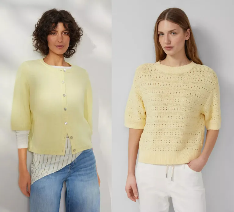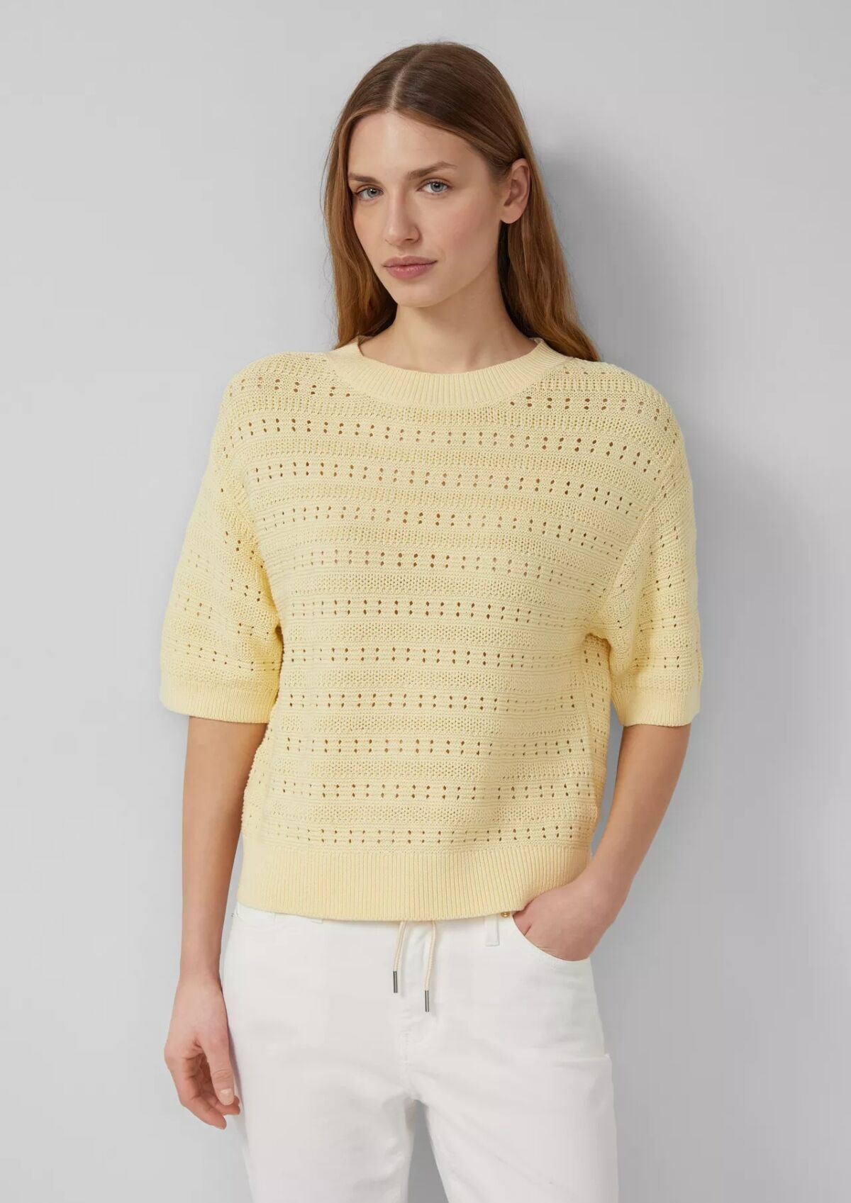 Mit diesem Look setzt du auf eine besonders leichte und feminine Interpretation von Butter Yellow. Der Ajour-Pullover mit Halbarm wirkt durch seine luftige Strickstruktur angenehm frisch und ist genau das Richtige für wärmere Frühlingstage. Dank seines unkomplizierten Schnitts kannst du ihn ganz entspannt einsetzen, ohne auf einen stilvollen Auftritt zu verzichten.