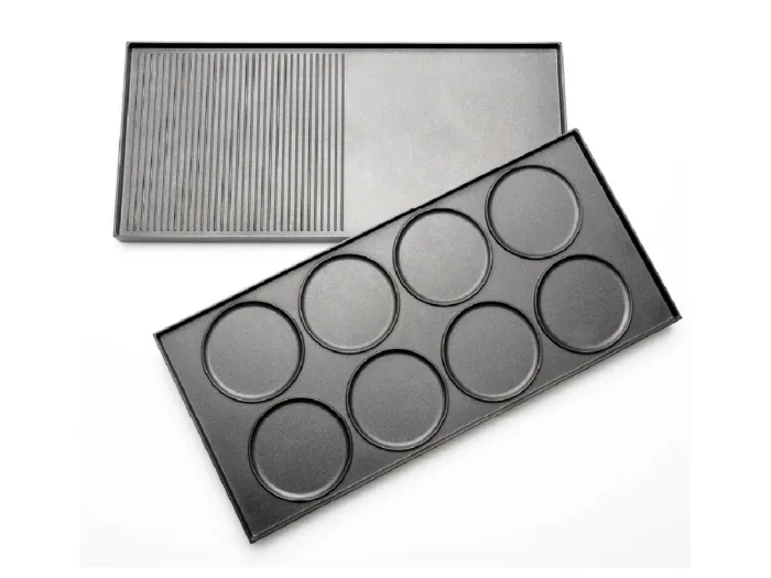 Mit einer grosszügigen Grillfläche von 24 x 53 cm, die zur Hälfte gerillt und zur Hälfte glatt ist, kannst du gleichzeitig verschiedene Speisen zubereiten. Die gerillte Plattenhälfte eignet sich hervorragend für Fleisch, Fisch oder Chipolatas, während die glatte Hälfte ideal für Gemüse, Spiegeleier, Crêpes oder Pfannkuchen ist. Zusätzlich bietet der Racletteofen Vertiefungen für die Zubereitung von 8 Crêpes.