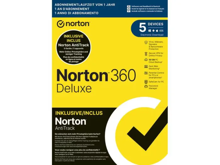 - Bundle mit Norton 360 Deluxe und AntiTrack für 5 Geräte