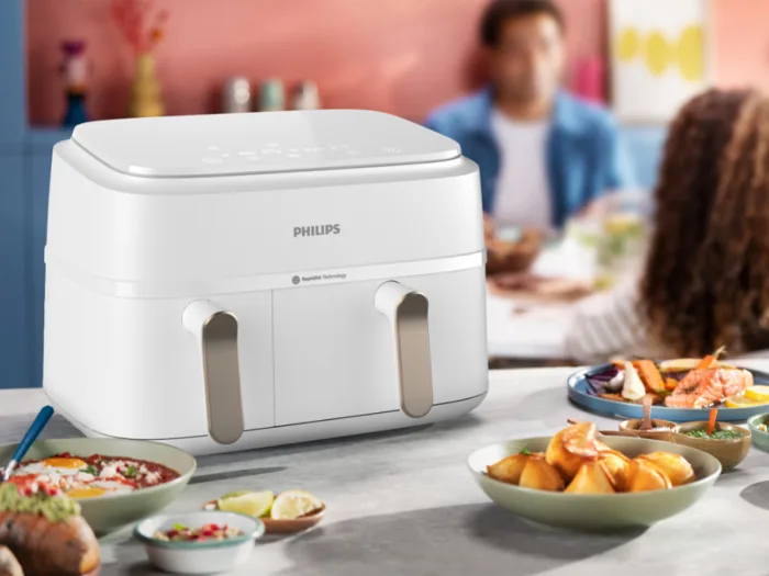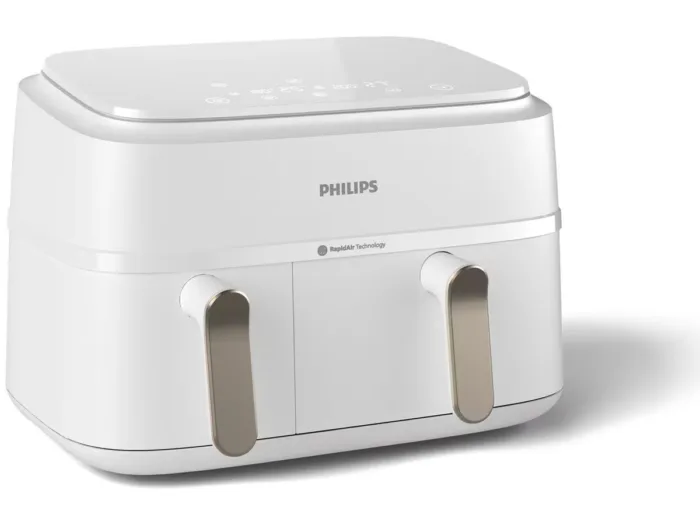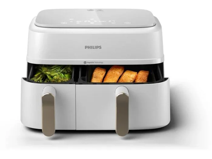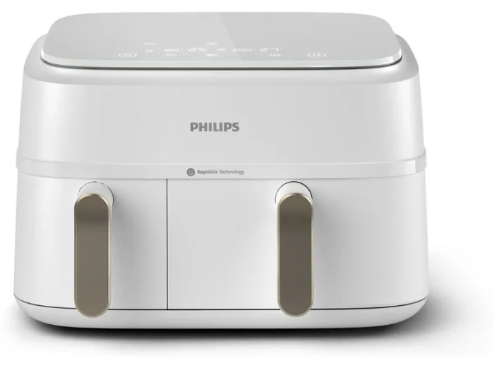 Mit dieser Heissluft-Fritteuse von Philips bringst du mühelos Abwechslung und Genuss in deine Küche. Dank der modernen RapidAir-Heisslufttechnologie gelingen dir knusprige, zarte und gleichmässig gegarte Speisen und das ganz ohne zusätzliches Öl. Ob Familienmahlzeit im grossen 9-Liter-Korb oder Beilage im kleineren Korb: Du bereitest alles gleichzeitig zu und servierst es heiss auf den Tisch. Die Copy-Funktion übernimmt Garzeit und Temperatur für beide Körbe auf Knopfdruck, während der Synchronisations-Timer dafür sorgt, dass alles exakt zur selben Zeit fertig wird. Über das intuitive Touchscreen mit 8 automatischen Kochprogrammen wählst du dein Wunschgericht in Sekunden aus.