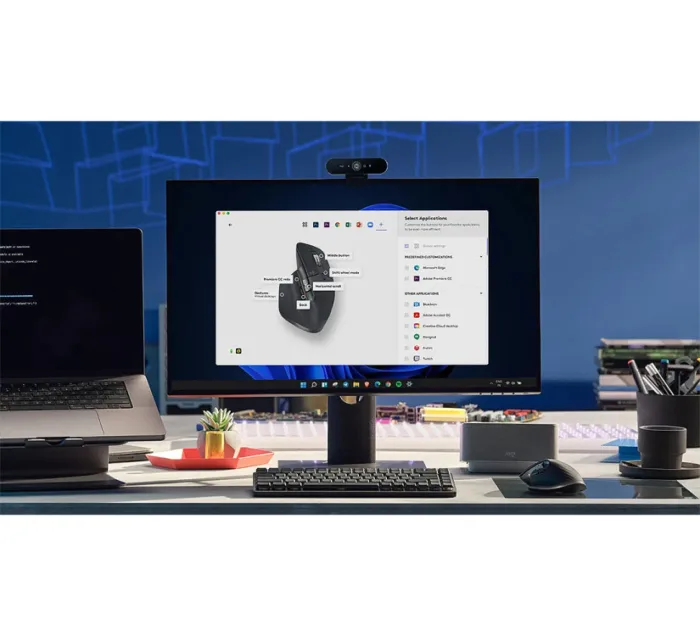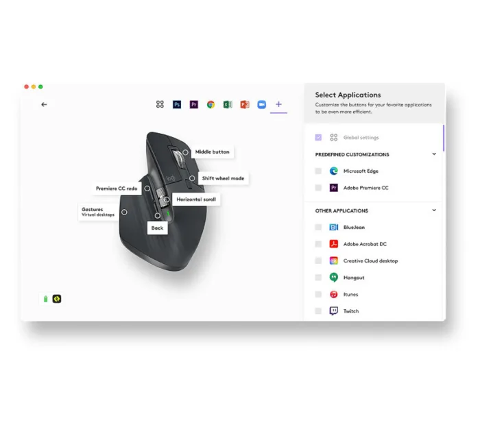 MX Master 3S ist in praktisch jeder App, die du verwendest, vollständig anpassbar. Arbeite schneller mit vordefinierten, für deine Lieblingsanwendungen (wie Adobe Photoshop, Adobe Premiere Pro, Final Cut Pro, Google Chrome, Safari, Zoom und Microsoft Teams, Word, Excel, PowerPoint und Edge) optimierten Anpassungen.