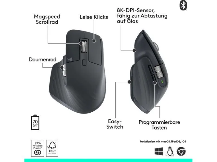 MX Master 3S hat mit einer vollen Aufladung bis zu 70 Tage lang Energie – und eine Schnellladung von einer Minute ergibt drei Stunden Nutzungsdauer. Das Aufladen erfolgt über ein mitgeliefertes USB-C-Kabel. MX Master 3S ist direkt ab Werk mit allen gängigen Betriebssystemen kompatibel, z. B. Windows, macOS, Chrome OS oder Linux. Deine Maus lässt sich sofort mit bis zu drei Geräten über Bluetooth Low Energy pairen.