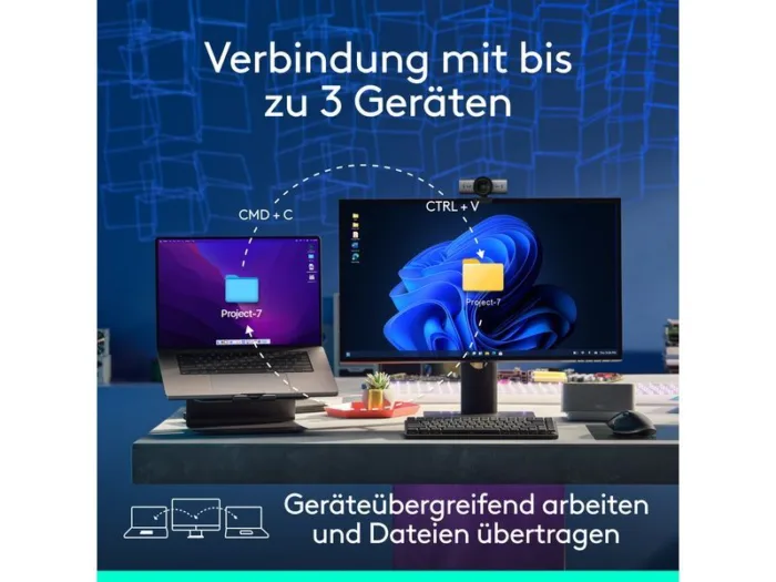 Mit Logi Options+ wechselst du automatisch zwischen deinen Computern, indem du einfach den Cursor zum Bildschirmrand bewegst. Deine MX-Tastatur folgt deiner MX Master 3S und ermöglicht nahtloses Arbeiten zwischen Windows und macOS. Text, Bilder und Dateien mühelos zwischen Computern übertragen – einfach auf einem Computer kopieren und beim anderen einfügen.