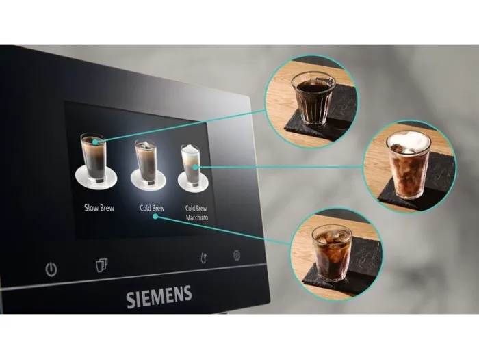 Dieser Kaffeevollautomat von Siemens bringt dir jeden Tag aufs Neue Komfort und Genuss in die Küche. Mit dem intuitiven 5"-iSelect-Touchdisplay, individuell einstellbarem Mahlgrad und bis zu zehn speicherbaren Lieblingsgetränken bekommst du genau den Kaffee, der zu deinem Moment passt. Ob Espresso, Cappuccino, Cold Brew, Latte macchiato oder feinster Milchschaum – aus bis zu 36 Heiss- und Kaltgetränken wählst du deine persönliche Spezialität. Grosszügige 2,4 l Wassertankkapazität, 320 g Bohnenvolumen und ein höhenverstellbarer Kaffeeauslauf sorgen dafür, dass du jederzeit flexibel bleibst.