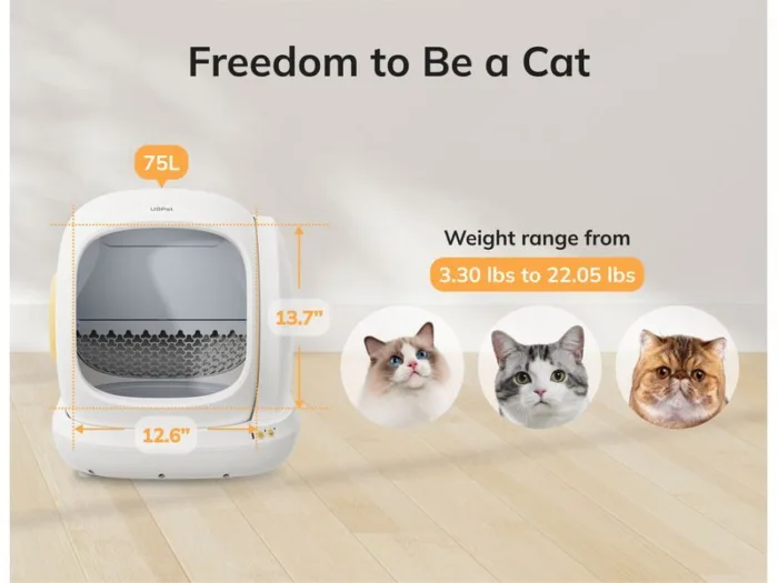 Das grosszügige, offene Design der UBPet-C20-Toilette gibt deiner Katze viel Bewegungsfreiheit. Sie kann sich darin drehen, wenden und problemlos ihre natürlichen Instinkte ausleben. Der extra niedrige Einstieg mit einer Höhe von nur 17,4 Zentimetern ist ideal für ältere Katzen oder Katzen mit kurzen Beinen, sodass sie sicher und bequem Zugang zur Katzentoilette haben.