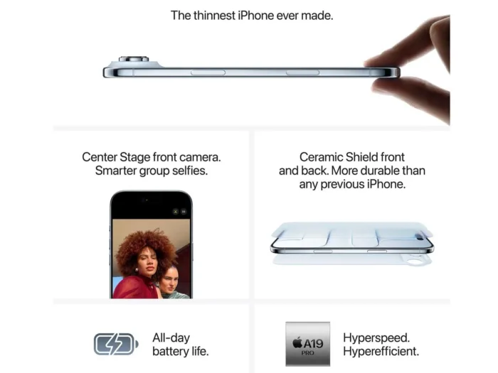 Mit nur 5,6 mm Tiefe und einem Rahmen aus Titan gehört das iPhone Air zu den dünnsten iPhones aller Zeiten. Ceramic Shield auf Vorder- und Rückseite sowie der Schutz nach IP68 sorgen für hohe Widerstandsfähigkeit gegen Wasser und Staub – trotz seinem schlanken Design.