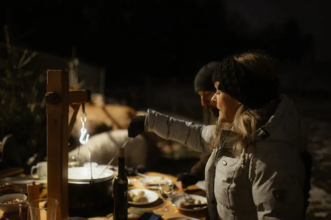 Gemütliches Fondue mit Alpakas unter freiem Himmel