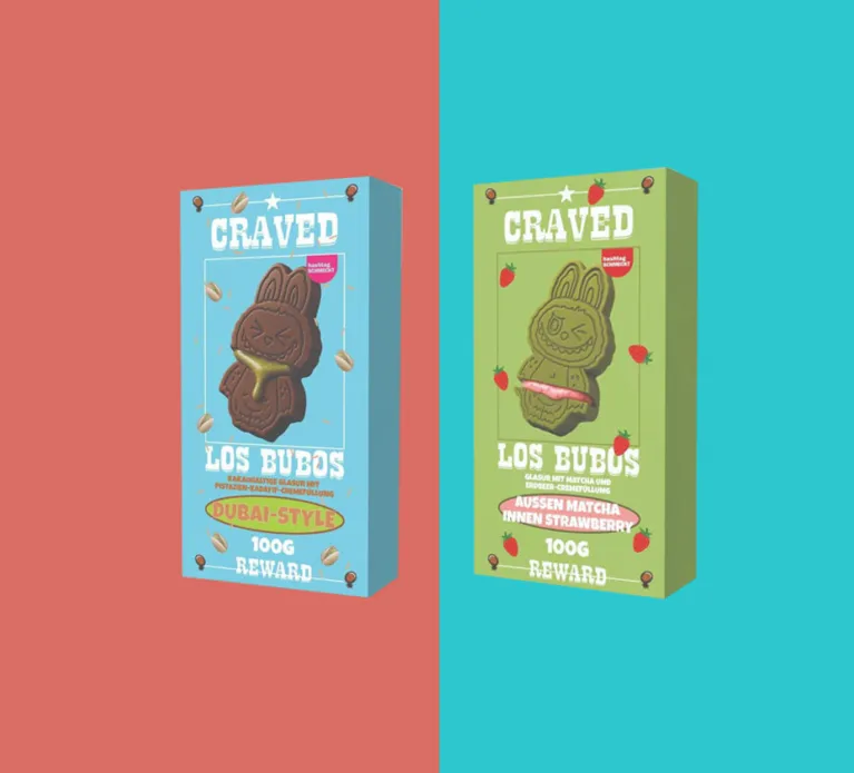 Zwei Trends in einem gibt es nun mit der Schokolade von Crazed: Schokolade in Labubu-Form, gefüllt mit Pistaziencreme oder mit Matcha-Glasur und Erdbeerfüllung!