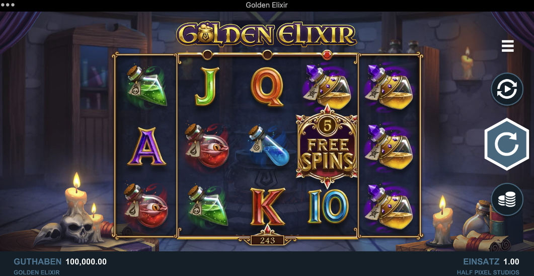 So beispielsweise den Slot Golden ElixirLink opens in a new tab, bei welchem du in eine typische Alchemistenkammer eintauchen kannst. Dort geht es darum, Buchstaben oder Zaubertränke in eine Reihe zu bringen. Du hast die Chance auf das 2400-fache deines Einsatzes auf 243 Gewinnlinien mit einer Ausschüttungsquote von 96,19%. Der Minimaleinsatz beträgt 20 Rappen, der Maximaleinsatz 100 Franken.