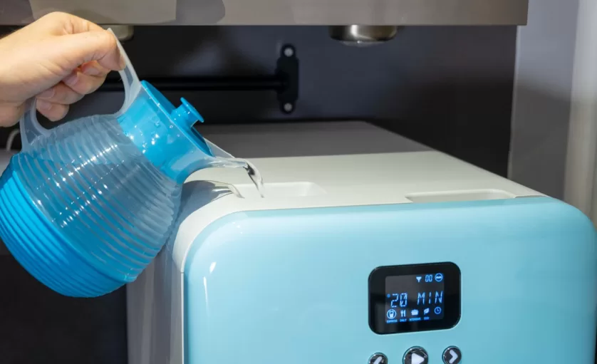 Zwar kann man den Mini-Geschirrspüler wie herkömmliche Geräte direkt an die Wasserzufuhr anschliessen, muss man aber nicht. Denn Bob verfügt über einen grossen Tank, der 3,9 Liter Wasser fasst. Dieser kann praktischerweise von der Vorderseite her befüllt werden, sodass man die Spülmaschine nahe an einer Wand oder unter einen Küchenschrank platzieren kann, ohne sie ständig bewegen zu müssen.
