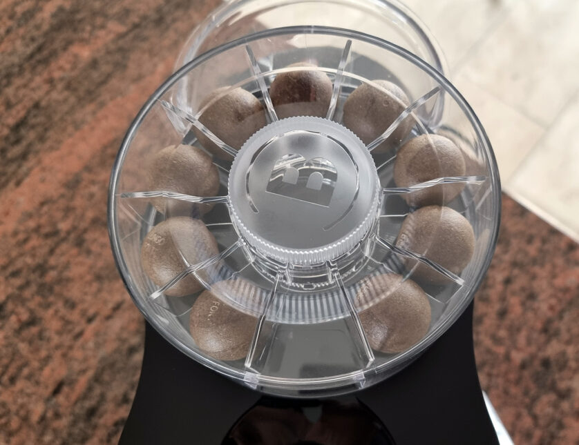 Die Bedienung der Maschine ist einfach und intuitiv. Für das Brühen des Kaffees gibt man den Kaffeeball in die Maschine hinein und betätigt den Hebel auf der Seite. Alternativ kann man den Coffee-Ball-Dispenser auf der Oberseite der Maschine mit Bällchen auffüllen, sodass man nicht jedes Mal auf Neue einen Kaffeeball hervorkramen muss.