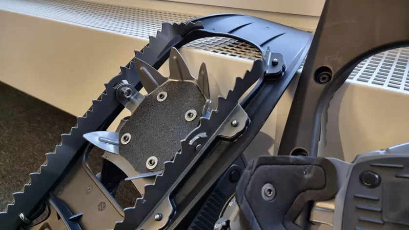 Die robusten Kunststoffdecks mit Aluminiumrahmen sind griffig und geben dem Modell «Arduus Highlander» seine Trittsicherheit. Die Stahlsteigeisen der Schuhe sind leicht und dank der Ratschenbindung einfach und zügig an- und auszuziehen. Für zusätzlichen Komfort auf jedem Gelände sorgen die Fersenbindungen mit Fersenlift.