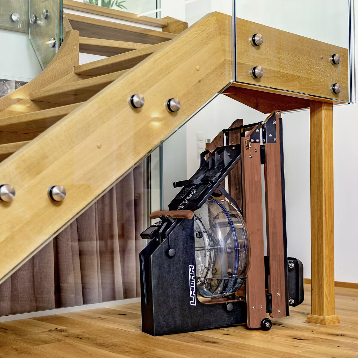 Mit seinen kompakten Massen von 208 x 58 x 58 Zentimetern und dem edlen Look in Dunkelbraun aus echtem Kiefernholz fügt sich das Rudergerät perfekt in dein Zuhause ein. Aber du hast viel zu wenig Platz für ein Rudergerät? Kein Problem! Dieses Modell ist klappbar, vertikal aufstellbar und dank integrierter Transportrollen schnell verstaut. So kann das Rudergerät nach dem Work-out im Schrank, in der Ecke oder dem Abstellraum verstaut werden und nimmt keinen unnötigen Platz ein.
