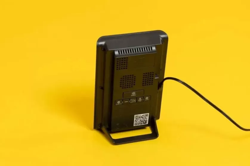 Die Rückseite versteckt alle unschönen Öffnungen gekonnt, auch die Bedienungstasten sind hier zu finden. Die Vorderseite wird von einem grossen Bildschirm fast vollständig ausgefüllt und von dem unscheinbaren Rahmen umgeben. Tatsächlich erinnert die Form an ein modernes Smartphone, was durch die aufrechte Position verstärkt wird.