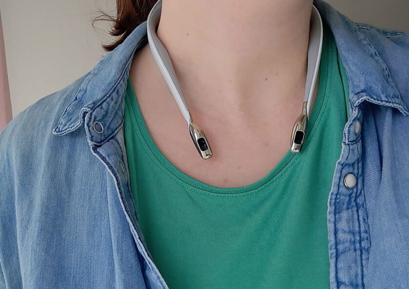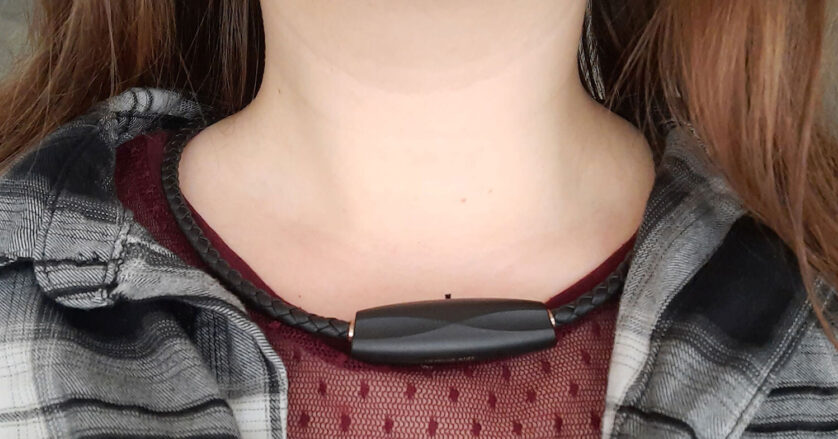 Das weisse Halsband Airvida L1 war beim Tragen zunächst etwas ungewohnt, aber nach wenigen Minuten habe ich gar nicht mehr gespürt, dass mir da etwas wortwörtlich im Nacken sitzt. Hat man längere Haare und trägt diese offen, sehen andere bei diesem Modell gar nicht, dass man einen Luftreiniger mit sich trägt. Aber verstecken muss man das Halsband nicht, da es meiner Meinung nach sehr stylisch aussieht – fast schon wie ein fancy Modeaccessoire.