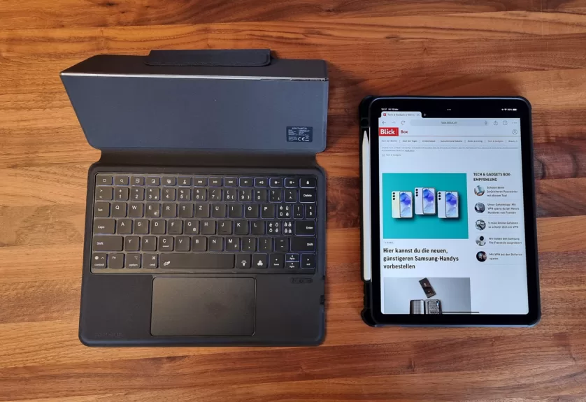 Es ist mit einer voll ausgerüsteten, beleuchteten Tastatur im CH-Layout ausgestattet und mittels Trackpad kannst du das iPad wie einen Laptop mit Cursor bedienen und durch Klicken Dinge auf dem Bildschirm auswählen. Zusätzlich kannst du natürlich nach wie vor vom Touchscreen deines iPads profitieren.