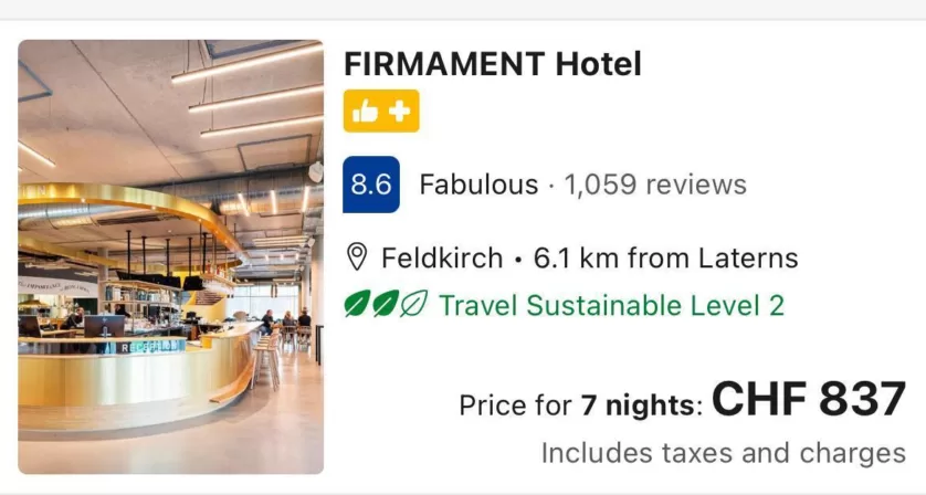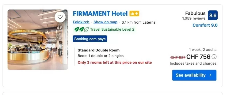 Wir haben ein Hotel auf booking.com gesucht, im Zeitraum vom 9. bis zum 16. Februar 2024. Zunächst haben wir mit einer Schweizer IP-Adresse über das Portal gesucht, um zu sehen, wie hoch der Preis in der Schweiz ist, anschliessend haben wir uns mit einem Server in Slowenien verbunden. Der Preis für zwei Personen unterschied sich hier um 81 Franken.